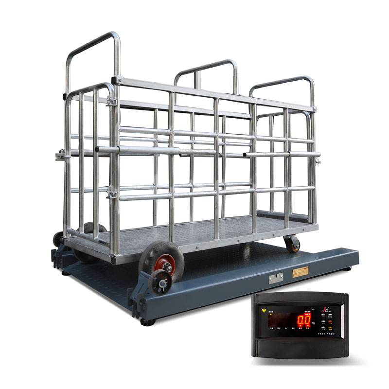 秤體拋丸噴塑工藝處理,防銹防腐耐劃傷。 秤體雙坡道設(shè)計(jì)便于推抓豬籠上秤,雙側(cè)帶防跌落臺(tái)防止豬籠下滑,底部帶兩個(gè)移動(dòng)輪方便秤體移動(dòng)。